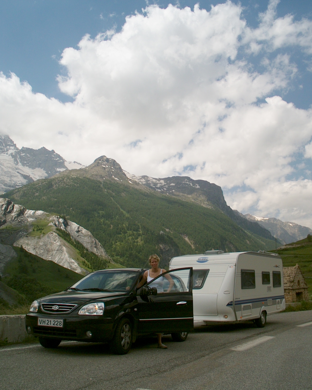 Selv om vi avslutter Alpene med et lite ukjent fjell, blir vi bare enda en gang gjort oppmerksomme på, at vi skal passe på, når vi har campingvognen bak. Respekten tar vi med i bagasjen og får bruk for den, når vi skal over Pyreneene.