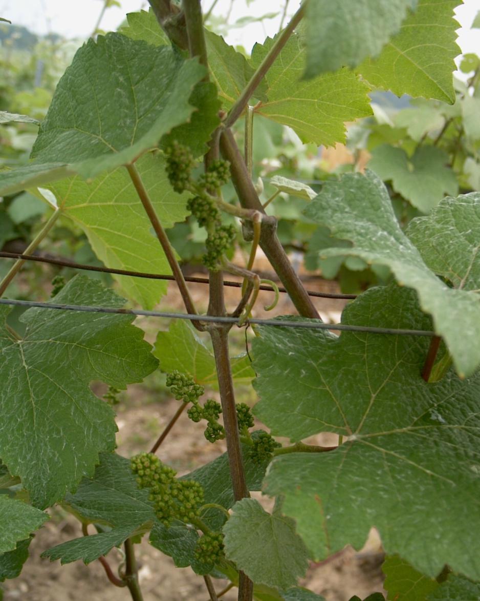 Selvom det er først til høsten, når druene skal høstes, at der virkelig er fart i den, skal vi likevel ut på vinmarken og se de små druene, som nesten er på vei inn i blomstringsperioden. En periode, som er veldig spesiell fordi de bitte små blomstene dufter så godt. En klase druer veier på dette tidspunktet 15 gram og vokser til ca. 450 gram på 3 – 3½ måned.