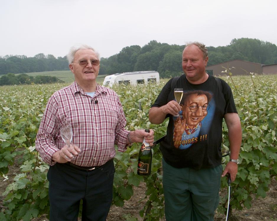 Selv om det umiddelbart ikke virker som om det er mye å passe på nå, forteller Mr. Lamblot, at det pusles med vinrankene hver dag. Hele prosessen kontrolleres fra start til slutt. Her kommer en av jordarbeiderne forbi, tilfeldigvis akkurat på det tidspunkt, da vi er i ferd med å smake på Rene Lamblots egen champagne, som har vunnet mange premier.