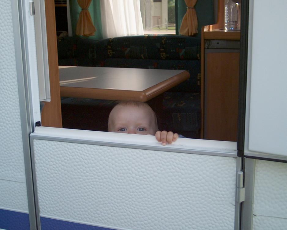 Vi finner campingplassen midt i byen Sedan, der dagens etappe slutter. Den ligger også helt ned til en liten elv og en mindre havn. Mens vi kommer på plass, styrer Mathias aktivitetenes gang fra campingvognen, der han akkurat kan følge med fra døråpningen. Gresset, som han ellers elsker å krabbe på, er veldig vått. Perfekt at døren i campingvognen kan åpnes i to deler.