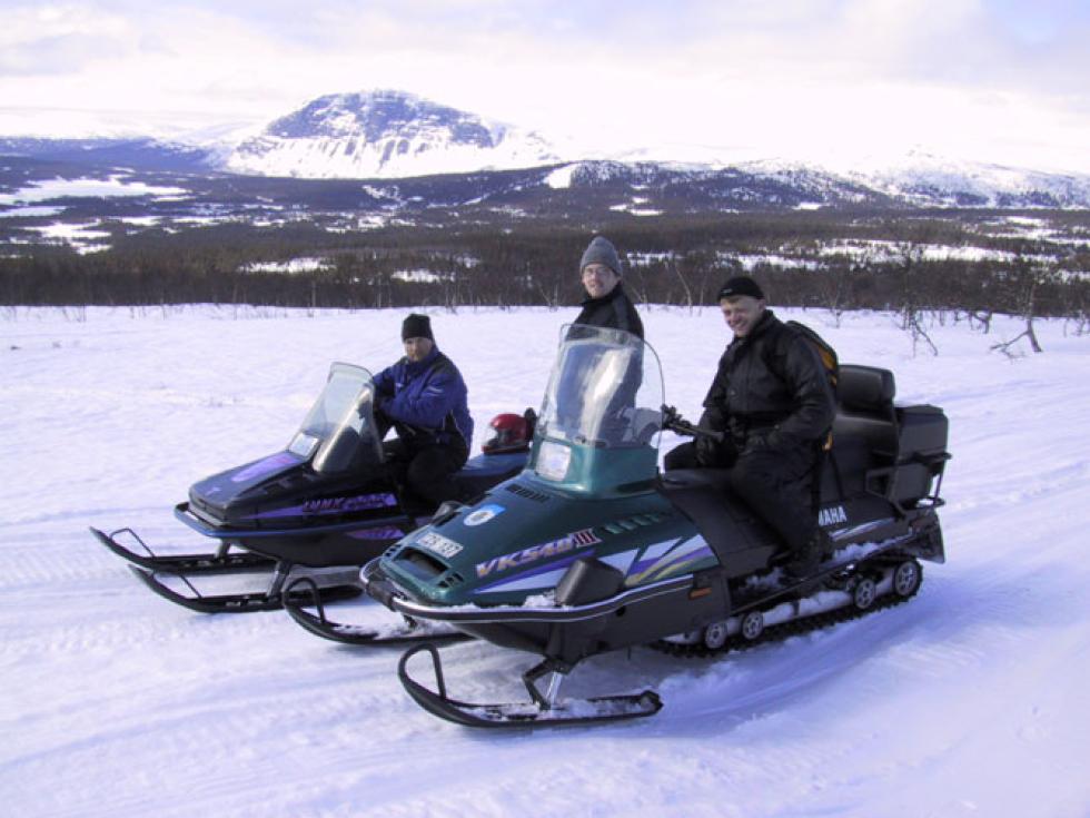 Normalt kan det nok være ekstremt kaldt å kjøre på snøscooter pga. farten og kulden, men om våren, når solen skinner som i dag, er det ganske behagelig, og på en av fjelltoppene nyter vi en god medbrakt lunsj. Utsikten er imponerende. På veien ned i dalen stopper vi ved en samisk kåte (trehytte formet som en tipi).I gamle dager bodde samene i kåtene, og nå bruker de dem som overnattingssted, når reinsdyrene skal flyttes. På fjellet har man en uskrevet regel, som sier at hytter og kåter skal stå ulåst, slik at alle kan bruke dem i nødstilfelle. F.eks. hvis du blir overrasket av storm og må søke ly. Dessverre har en del misbrukt denne gesten, og derfor ser man i dag flere kåter med hengelås på.