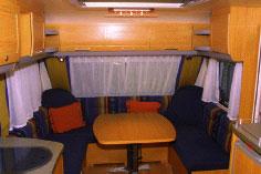 Tar vi steget inn i vognen møter det oss et helt nytt design, både i utforming og farger. Planløsningen er ganske så tradisjonell, men de nye elementene gir oss et inntrykk av noe nytt likevel. Nye polster, en moderne kjøkkenbenk og bedre belysning fra et antall spotter. Først til planløsningen. Knaus-modellene leveres nå med et større utvalg av planløsninger.Som vi kan se av skissen er denne vognen utstyrt med rundsittegruppe foran, kjøkken og bad i midten, og dobbeltseng og kombinerte overskap/køyesenger bakerst. Nærmeste sammenligning til denne vognen er 580 UE, som vi forklarte tidligere. Vi nevnte nytt polster, Romance eller Festival, på puter og sittegrupper. De er gjennomført med en mørk blå grunnfarge på sitteputene, et fargespill i den samme blåfargen, oransje og gult i ryggputene og en dyp oransje i alle løse puter. Virkelig smakfullt.Kjøkkenbenken er også noe for seg selv. Knaus har kuttet ut de tradisjonelle kokeplaten med fire bluss, og erstattet denne med tre bluss som ligger etter hverandre. Det gir ikke bare et mer moderne utseende, men det er også mer praktisk da det frigjør arbeidsplass på benkeplaten.