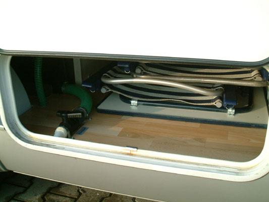 Bobilen har både fersk- og spillvannstank. Spillvannstanken tømmes med et håndtak, som sitter praktisk plassert først i et av oppbevaringsrommene. Ved siden av døren er det et høyt oppbevaringsrom. Under badeværelset og rundsittegruppen er det likeledes to store romslige oppbevaringsrom. Med andre ord riktig god plass til campingmøbler, grill med mer.Bobilen er helt ideel for to voksne med to barn, da er det god plass til alle. 3 barn kan også gå. Selv om bobilen er rimelig stor er den lett å komme rundt med og er god å kjøre. Det lyse treverket og de blå fargene gir en behagelig atmosfære samtidig med at trekket ikke er sart, når det er barn i familien. Det store vinduet ved sittegruppen gir et godt utsyn for passasjerene bak.