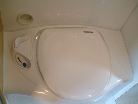 Ved siden av kjøkkenet er det bad og toalett. Toalettet er av Thetford’s fabrikat med elektronisk spyling. Hele partiet med håndvask og skap kan skyves bort over toalettet, slik at det blir et stort dusjkabinett. Fordelen med dette er, at man slipper et vått baderom samtidig med, at det ikke er brukt ekstra plass til et dusjkabinett. En virkelig effektiv løsning.