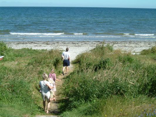 Vi fortsetter ned på stranden, der dagens solbadende gjester så smått er i ferd med å pakke og dra hjem til campingvognene på plassen. En far og sønn er imidlertid i ferd med å sette kanoen på det stille vannet. De kan få tid til en liten tur, før det er tid for mat. Lengre ned på stranden håper en sportsfisker på litt flaks, kanskje er ikke kveldsmaten i hus ennå.Mens Mathias er i full gang med å samle stein og muslingskall, går det opp for meg, hvilken herlig campingplass vi har ”flyttet” inn på. Det er høyt under taket, frisk luft, deilig natur, barnevennlig strand og god plass til, at alle kan gjøre nøyaktig det de hadde planer om, før ferien startet. Det være seg å døse i liggestolen, til en tur på golfbanen eller på sykkel, eller bare syssle med sine egne små ting og gjøre noe av alt det, man ikke rekker til daglig. Det er rolig, selv om der egentlig er mange barn.