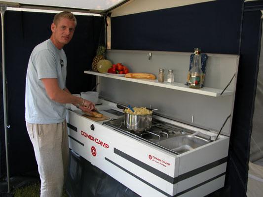 Carsten:Jeg elsker å være ute i naturen, og det er praktfullt å stå ute i det fri og lage mat. Skulle det bli dårlig vær, er det enkelt å kjøre kjøkkenmarkisen eller sette opp solseilet. Hvis vi ligger lengere tid et sted setter vi på forteltet og så har vi dobbelt så stor plass som ellers. Sengen er også stor, så selv om vi engang får et par barn med oss, er det fortsatt godt med plass.Kjøkkenet er praktisk, fordi det er plassert ute på teltvognen. Man kan kjøre inn til siden og spise lunsj uten å måtte åpne det hele. Det er akkurat det man trenger: kjøleboks, vann og gassbluss. Det er godt med avlastningsplass, men man kunne godt trenge litt mer skapplass. Et tips ville være å legge skjærebrett/bordplate oppe på kjøleboksen.