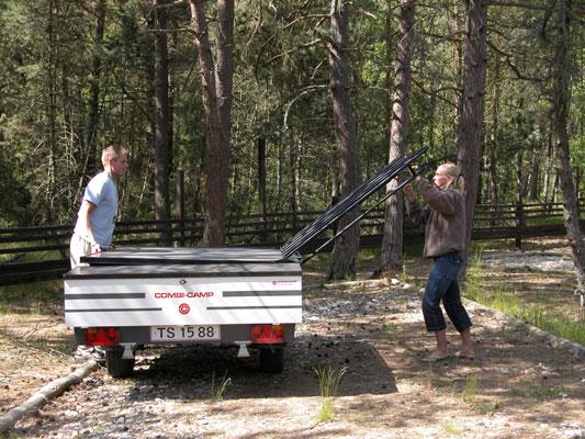 Carsten:Jeg er overrasket over hvor enkel den er å slå opp. Det høres kanskje overdrevent ut, men det tar virkelig bare 30 sekunder. Man åpner lokket, løfter det rundt, så det blir gulv. Deretter løftes to sidestenger, som spenner ut teltduken og så er man på plass. Vil man ha ekstra stabilitet sveiver man ned de fire støttebenene.Linette:Jeg har alltid ganske mye tøy med på turene våre, og når det er med telt, ligger det i sportsbagger i bilen. Denne gang la vi Combi Campens fortelt inn bak i bilen og så pakket vi tøyet i lasterommet under dobbeltsengen. Jakker og hva man ellers kan få bruk for i løpet av dagen lot vi ligge i bilen. Vi har som noe ekstra fått satt på en frontboks. Det gir ekstra oppbevaringsplass.Det sjenerer ikke meg å kjøre med Combi Campen bak på bilen. Man merker ikke at den er på og utsynet er bra. Den er også utrolig lett å koble av og på og kan skyves på plass av en person. Det overrasker meg.