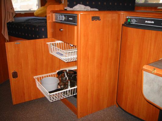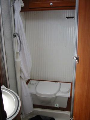 Inngangen til bobilen skjer midt i bilen. Når man kommer inn i bilen finner man det praktiske vinkelkjøkkenet med overskap, vask, tre kokebluss, skap med uttrekksskuffer til gryter og panner samt en bestikkskuff og et 89 liters Dometic kjøleskap, inneholdende en 6,5 liters fryseboks.Toalett/baderom:I den bakerste delen av vognen finnes badeværelset som etter campingforhold er romslig. Et stort Thetford toalett med elektronisk spyling finnes i enden av rommet og over det sitter et praktisk innredet baderomsskap. Et forheng skjermer mot vann på toalettet da dusjen er plassert i umiddelbar nærhet.I motsatt ende av toalett og baderom finnes håndvask, speil med hylle og underskap, som avskjermes med to pleksiglassdører mot vannsprut. En god innredning.