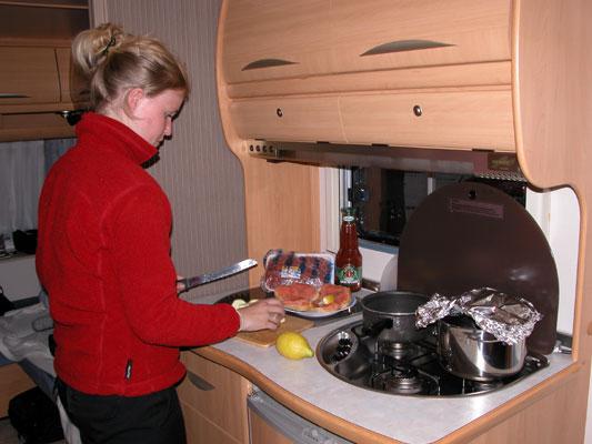 Kjøkkenet er ikke spesielt stort, men stort nok. Det har de obligatoriske tre gassbluss, oppvaskkum og kjøleskap. Akseptabelt med benkeplass. Skapplassen har en veldig fornuftig fordeling mellom vanlige skap, skuffer og trådkurver, som kan trekkes ut.Toalett:Toalettet er ikke så veldig stort. Er man over to meter blir det vanskelig å få plass til bena, når man sitter på det. Men det er plass til det man skal: toalettbesøk, pusse tenner og vaske hender og det er fornuftig, at det ikke er brukt mer plass på dette rommet. Men det er selvfølgelig en smakssak.