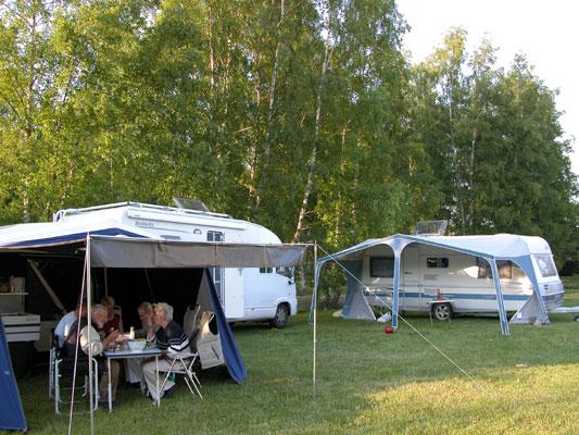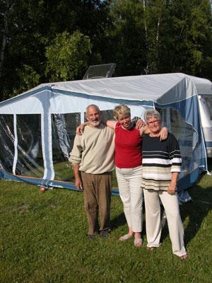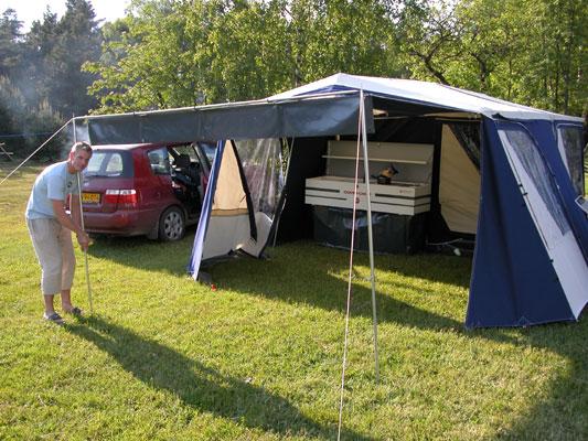 Vi har egentlig ikke bodd på så mange campingplasser med gress, så i dag vil vi benytte anledningen til å sette opp forteltet. Jeg setter i gang med å legge ut stengene i gresset, der hvor de skal brukes. Britta og Ole hjelper meg med å trekke forteltet på campingvognen, og i løpet av en halv time har vi dobbelt så mye plass. Britta og Ole, som tidligere har campet mye med campingvogn, men som de siste årene utelukkende har kjørt bobil, er imponert over utviklingen. De husker forteltoppsetting, som noe som tok tid. Noe som var tungt og vanskelig. Men slik er det ikke lenger. Jo, kanskje de første par gangene.