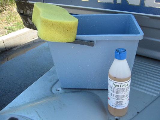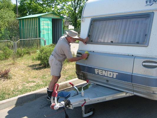 Vi skrubber lenge og må i tillegg smøre den konsentrerte væsken på, før skitten begynner å løsne. Men med étt går det lettere. Den bløte svampen fjerner skitt og vi får fronten helt ren. Ole gir samtidig også fronten på Dethleffs´n en omgang. Våre vogntog har ikke vært så rene, siden vi reiste hjemmefra.