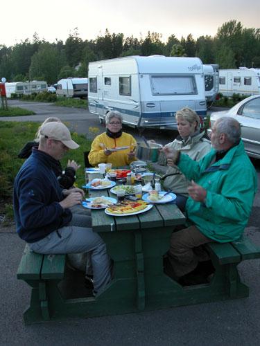 Tilbake på campingplassen fyrer Carsten og Ole opp grillen og den ferske fisken tilberedes med omhu. Vi dekker på ute foran vognene våre og hygger oss hele kvelden. Slik som enhver opplevelsesrik dag bør avsluttes.