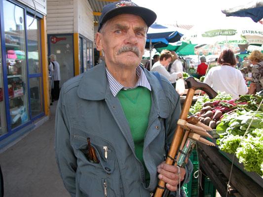 I godt vær, som i dag, er det også marked på utsiden. Vi kjøper et glass honning (ca. 10 kr.) og en hjemmelaget pottehatt (ca. 10 kr.) til Mathias. En eldre herre henvender seg med en merkelig tingest. En kombinasjon av en gammel paraplystang, som kan foldes ut med en hjemmelaget rive i den ene enden. Mannen smiler og viser, at den både kan brukes som rive og kløpinne. Mathias synes den er utrolig spennende, så vi ender opp med å kjøpe den for 2 Euro (ca. 17 kr.). Sikkert alt for mye, men sånn er der jo med så mye.