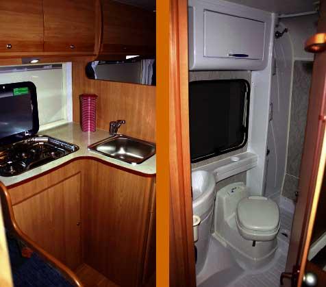 Kjøkkenbenken i vinkel (100 x 54/ 100 x h 93 cm) må avgi plass til gasskassen og skapplassen er dermed noe amputert. Men kjøleskapet er som tidligere nevnt plassert på motsatt side slik at benken rommer det viktigste. Historisk er det at denne bilen er den første vi presenterer uten Elektrolux kjøleskap. I enkelte modeller har Elnagh valgt et skap fra konkurrenten Thetford og typebetegnelsen er N145. Det er et 140 ltr. Skap med SES (tilsvarer AES, automatisk energivalg). Skapet har et volum på netto 134 ltr. hvorav frysedelen utgjør 23 ltr.. Videre har benken tre bluss, nedfellt med glasslokk og kum uten lokk. Det er to overskap, av utstyr for øvrig: lampe, vindu og bilens eneste takluke.Bad:Toalettrommet (87 x 99 x h 188 cm) har separat dusj (55 x 86 x h 188 cm). I denne typen biler hvor toalettrommet er anbrakt ved siden av dobbeltsengen, er det normalt ganske trangt og her merket jeg straks at det var litt romsligere. Interiøret er hvit plast og det er rikelig med speil. Lufting besørges av takventil og vindu. Sistnevnte har opalt glass men ingen gardin. Er det mørkt ute og lyst inne kan du utenfra lett se hva som foregår innenfor (skygger). Det lille overskapet (uten hylle) og skapet under vasken er begge i minste laget. Dusjen er bra fuget, men dusjforhenget er for kort.