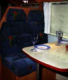 Sittegruppen inkluderer setene i førerhuset. Med toseteren bakenfor bordet og toseteren på langs blir det god plass til seks personer. Av ukjente årsaker er sittehøyden gulv/ overkant sittepute 56 cm, slik at mange vil sitte å dingle med bena! Bordet varierer i bredde fra 60 til 71 cm og ved hjelp av et ileggsbrett kan lengden økes fra 95 til 150 cm. Bakre sittebenk er utstyrt med et trepunktsbelte og et hoftebelte. I benken er det rom for bagasje. Sidebenken inneholder vanntank (115 ltr.) og trykkpumpe (Aqua 8). I følge brosjyren skulle sittegruppen kunne omgjøres til seng med målene 215 x 120 cm, men dette var det ingen av oss som fikk til.Sittegruppen inkluderer setene i førerhuset. Med toseteren bakenfor bordet og toseteren på langs blir det god plass til seks personer. Av ukjente årsaker er sittehøyden gulv/ overkant sittepute 56 cm, slik at mange vil sitte å dingle med bena! Bordet varierer i bredde fra 60 til 71 cm og ved hjelp av et ileggsbrett kan lengden økes fra 95 til 150 cm. Bakre sittebenk er utstyrt med et trepunktsbelte og et hoftebelte. I benken er det rom for bagasje. Sidebenken inneholder vanntank (115 ltr.) og trykkpumpe (Aqua 8). I følge brosjyren skulle sittegruppen kunne omgjøres til seng med målene 215 x 120 cm, men dette var det ingen av oss som fikk til.
