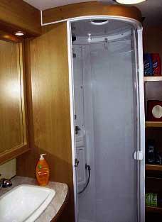 Utførelsen på badet er ganske lik den som kom på Royal i 2002, hvor du finner et stort og romslig baderom med toalett på den ene siden, vask i midten og et eget rundt dusjkabinett på den andre siden. Dusjkabinettet er spesielt med den runde formen, og du kan kjenne den igjen fra Fleetwood-vognene produsert av Kabe i England.Baderommet føles romslig og det er ingen problemer med for liten plass her. Godt med skapplass, håndkleholdere over varmeelementene og en dusj uten fare for vannsøl. Her er det plass til både tannpuss, dusj og toalettbesøk samtidig, om man måtte ønske det.Nyheten med baderomløsningen er altså at den fås i flere av Kabes modellstørrelser, men ideen i seg selv er ikke ny. Det er derimot løsningen på dobbeltsengen i TDLvognene. Den er nemlig konstruert slik at du enkelt kan trekke ut siden og lage den bredere. Madrassen følger med og utvider seg likeledes. Fra å ha en bredde på 120 cm kan du med enkelhet dra den ut til 140 cm bredde.