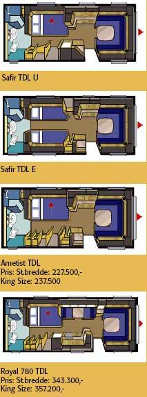 Kabe Safir TDL UChassis: Al-KoKarroseri: Sandwich.Garantier: To års garanti og fire års tetthetsgaranti.Pris veil.: Kr. 245.800,- i st.bredde, 257.800,- i king size bredde.Produksjon: Kabe, SverigeSted: NorCamp, NittedalVekt og mål:Totalvekt: 1.600 kg.Egenvekt: 1.300 kg (stb) og 1.350 kg (ksb).Maks last: 300/350 kg.Totallengde inkl. drag: 762 cm.Karr. lengde: 587 cm.Totalbredde innv.: 215 cm. (stb) og235 cm. (ksb)Totalhøyde innv.: 196 cm.Soveplasser: 4Dobbeltseng std.: 205x168/164 cm.Dobbeltseng ksb.: 225x168/164 cm.Utstyr:Ferskvann: 40 liter.Spillvannstank: Innebygd, utvendig spillvannsekk.Toalettrom: Thetford dreibart spyletoalett.Dusj: Ja, rundt kabinett.Varme: Alde 3000Gulvvarme: Ja, vannbåren.Varmtvann: AldeTV-antenne: Ja, med forsterker.Radio/CD: Klargjort for installering.Kjøleskap: Dometic 103 liter.Ovn: Tre bluss.Kjøkkenvifte: JaPlanløsninger:Safir TDL USafir TDL EAmetist TDLRoyal 780 TDL