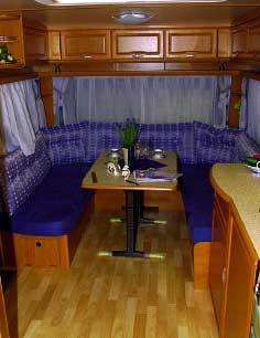 Når jeg setter meg ned i rundsitteren og ser meg rundt slår det meg som sagt at vognen har veldig god gulvplass. Uten at dette går ut over størrelsen på innredningen. Noe av grunnen til at gulvet synes større enn vanlig er den buede formen bad og dusjkabinett har fått. Det gir med en gang noen kvcm større plass. Jeg legger også merke til den elegante og klassiske gulvkomfyren som er montert i kjøkkenbenken. Den har fire kokebluss, stekeovn og en lekker lys beige farge. Vognen har gjennomgående blå farge på tekstilene, med og uten mønster.Alle skaplåser, spotter og lignende er gjennomført i den samme sølvgrå fargen vi fant utvendig. Tabbert sier selv at de har gjort forandringer til denne modellen fra tidligere produksjoner som skal gi kundene følelsenav mer rom. Det har de klart, og selv om Tabbert-vognene er over middels dyre her i Norge, vil dette være et alternativ man bør se på. Vivaldi-serien finner du prismessig mellom Da Vinci og Jeunesse.