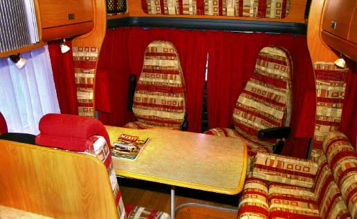 Den bakre sittebenken er som tidligere nevnt noe trang og ryggstøet er for rett. Benken er utstyrt med trepunkts belter og er det flere enn to i bilen, blir noen sittende her under transportetappene. Men for to personer spiller det liten rolle. Det variable bordet med ileggsbrett (98/138 x 60/52 cm) er en fin løsning. Sittegruppen kan forvandles til seng med mål 102 x 209 cm, som gir plass til en voksen eller to barn. Foruten bagasjerommet i sidesofaen er vanntanken (130 ltr.) plassert i bakre benk. I førerhuset i front er det et takskap. Sidene over dørene er ikke utnyttet. Forhenget her slutter 10 cm over gulvet og i kaldt vær må det tilleggisoleres.