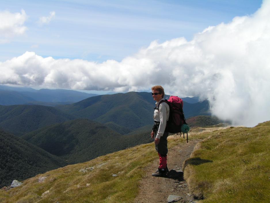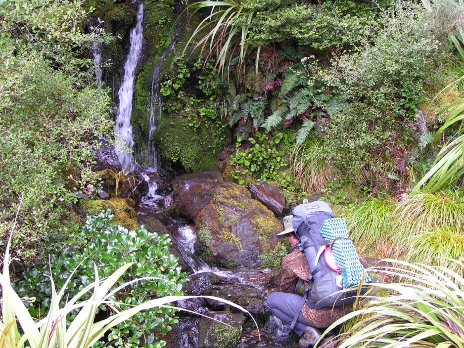 Vi har etterhvert drukket opp mesteparten av det vannet, vi fylte på i morges og Chris lover, at vi snart er framme ved et vannhull, der det kan passe å innta lunsjen.Vi har fortsatt skyene hengende under oss og de er i stadig bevegelse. Det er som om skyene samler seg nede i dalen. På den ene siden av fjellryggen har vi fritt utsyn, mens skyene ligger helt opp til fjellkammen på den andre siden.Vi kommer fram til vannhullet og stopper opp. Det er bare et lite vannhull på ca. 1 meter x 1 meter som blir forsynt fra en underjordisk kilde. Her er ikke noe til/avløp og vannet ser noe grumset ut.”Er det drikkevann?” spør vi. Men selv om Chris bekrefter, at det godt kan drikkes, har ingen lyst til å kaste seg over det. Vi er visst ikke tørste nok!Under lunsjen finner Chris plutselig kaffen!! Den må ha gjemt seg bort. ”Skal vi lage noe”, foreslår han, men ingen har lyst på kaffe nå.Bak oss reiser Mt. Arthur seg og når skyene er borte, har vi et flott skue over mot fjellet.