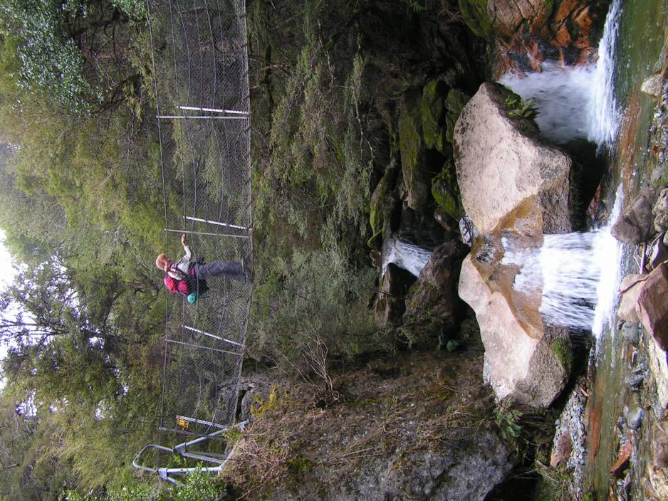Det varer ikke lenge, før det så smått begynner å gå oppover i terrenget. Jeg legger merke til, at det med jevne mellomrom sitter et lite blått merke på trærne og tror, at vi skal følge den blå-merkede ruten. Men merkene sitter litt ujevnt, så jeg er litt forundret. Chris forklarer, at det ikke er en markering for fotturister, men er en markering for å vise, der det er satt opp feller til å fange possums (pungrotter). Possums er til stor fare for skogen, så myndighetene forsøker på forskjellige måter å få utryddet disse skadedyrene. Ut over fellene legges det også ut gift og visse steder er (de største) trærne dekket med jernplater på stammen, som gjør det umulig for possums å klatre opp langs stammen.Og det er ikke enkelte blå merker vi møter. Her er hundrevis av dem og hver gang kan vi nå se, at det står en eller flere feller enten rett ved stien eller litt inne i skogen. Enkelte inneholder da også fangst. Det er vanskelig å se om det er en possum eller et annet dyr, som er gått i fella.Chris forteller om denne regnskogen, som mest består av løvfellende trær. Vi vil i løpet av neste uke komme til å oppleve forskjellige typer regnskog, forteller Chris, som viser seg å være særdeles godt orientert i botanikken. Faktisk har han vært veldig aktiv i forsvaret av de newzealandske regnskogene.Opp gjennom skogen har vi fulgt The Flora Stream og flere steder skal vi over elven på spinkle hengebroer med brusende fosser langt under oss. Enkelte steder skal vi hoppe fra sten til sten over elven, men det går helt fint. Etterhvert endrer landskapet seg til mer åpent gressbevokst terreng.Mot slutten av 1850-årene ble det funnet gull her i området og gullgraverne valfartet hit. Flere steder ser vi da også rester etter disse lykkejegerne og besøker enkelte hytter.Været er ikke det beste. Det er litt grått og innimellom kommer det litt regn.