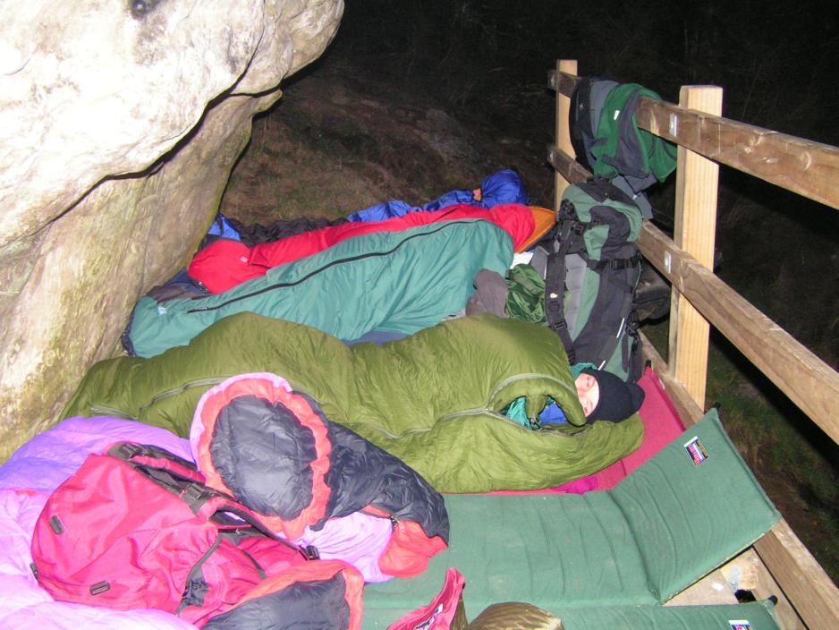 Ut på ettermiddagen kommer vi fram til The Rock Shelter, 1.080moh. – et naturlig klippeoverheng, som skal være overnattingsstedet vårt. Overhenget er vel rundt 3-4 meter, der det er bredest og fra oversiden av klippen drypper det ned vann.Under klippen er der stilt opp en hylle av tre, der vi kan ligge ca. 2 meter over bakken. Og her er akkurat plass til 8 liggeunderlag plassert tett ved siden av hverandre.Øverst oppe under klippeoverhenget har de tidligere beboerne – gullgraverne – murt en liten skinne, som fanger nedsigende vann og hindrer det i å renne ned langs klippeveggen. En genial dryppfanger!