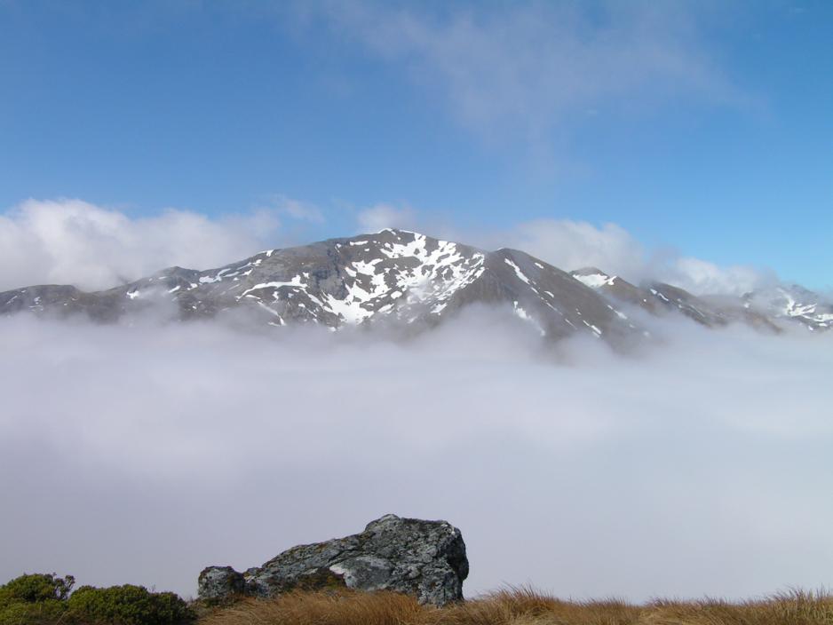 Og så plutselig - som ved et trylleslag – glir skyene ned langs fjellsiden og himmelen åpner seg foran oss.Begeistringen vil ingen ende ta. Nå kan vi se fjell rundt oss. Betagende fjell med snø på toppene.Nå er anstrengelsene ikke lenger forgjeves og med ett er humøret steget adskillige hakk. Mot vest kan vi se fjellkjeden – Tasman Mountains – og rett ovenfor oss reiser Mount Arthur seg med sine 1.795 meter.