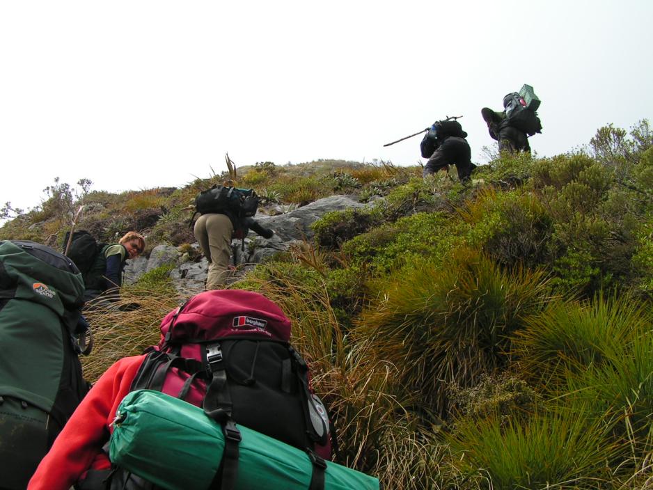 Gordons Pyramid er i sannhet et pyramideformet fjell, så vi skal ned igjen på den andre siden for å komme videre.Neste topp er ikke uten visse forhindringer. Over et stykke på ca. 15 meter er det regelrett fjellklatring.Noen av oss kan beholde ryggsekken på. Bl.a. Allis må ta den av og sekken blir transportert fra hånd til hånd opp over fjellene. Her kan de korte bena ikke nå høyt nok opp. Så med en hjelpende hånd, som trekker ovenfra og et lite dytt i baken, får vi hjulpet alle opp over denne utfordringen.