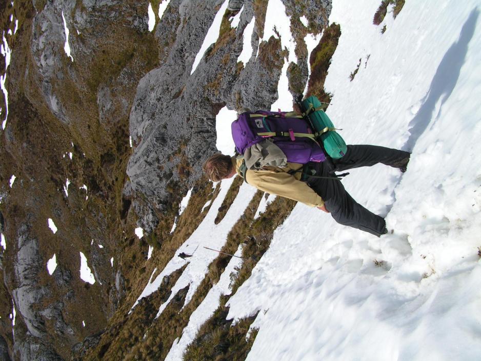 Vi har forsert den siste oppoverbakken – les fjell! – og skal begynne på nedturen.Flere steder ses dype hull i terrenget – flere med planker lagt på tvers over for at ingen skal falle ned i hullet. Hele området her er kjent for sine store hule-systemer, men de får vi ikke mulighet til å besøke på denne turen.Så møter vi snøen på nordsiden av fjellet, der solen enda ikke har kunnet smelte den helt vekk. Over flere strekninger går/glir vi nedover snøen. Flere strekk er over 100 meter lange.Vi kommer inn på sporet, som fører opp mot Mt. Arthur, men tiden er løpt fra oss og da det vil ta minst 2 timer å gå opp dit, foreslår Chris at vi fortsetter nedover.