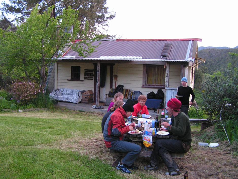 Vi har kjørt et par timer - gjennom Buller Gorge - til en liten hytte, der vi skal overnatte. Her er et kjøkken og et soverom med en dobbeltseng og en køye. De, som det ikke er plass til i sengene kan ligge på gulvet i soveværelset, eller i kjøkkenet – alternativt slå opp teltet. Allis og jeg velger alternativet. Og under et halvtak er vi et par stykker, som finner ly for duggen.Men fluene er her. De sjenerer oss, når vertinnen kommer med maten, som vi i dag ikke skal tilberede selv.Bak huset er det to åpne dokummer – dvs. uten dør - med utsikt til elven. Det er således ikke mulig å banke på for å finne ut om det er ledig – men et lite rop avklarer den aktuelle situasjonen!Bak kjøkkenet er det likeledes et åpent bad, og vi avtaler å få vasket av oss støvet fra Gordons Pyramid etter hverandre. Deilig med en varm dusj etter et par svette dager. Men da nestemann etter oss skal inn, er det ikke mer vann – verken varmt eller kaldt. Og i kjøkkenet stopper også tilførselen. Og husvertinnen kan ikke kontaktes på dette sene tidspunktet. Godt at vi har vann i elven til i morgen tidlig.Overnattingsstedet kunne vi vært heldigere med…