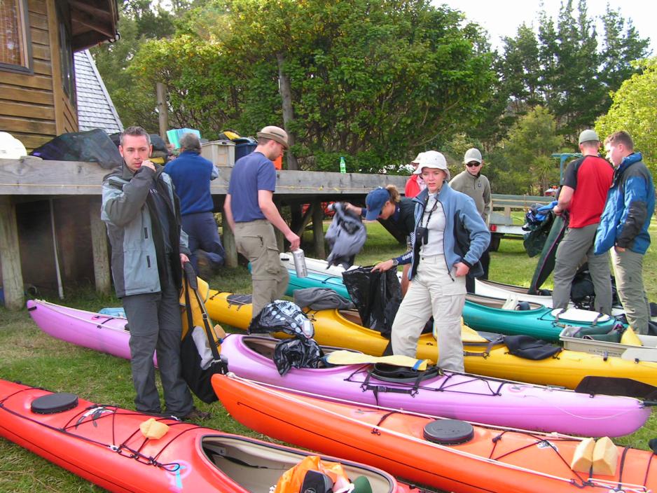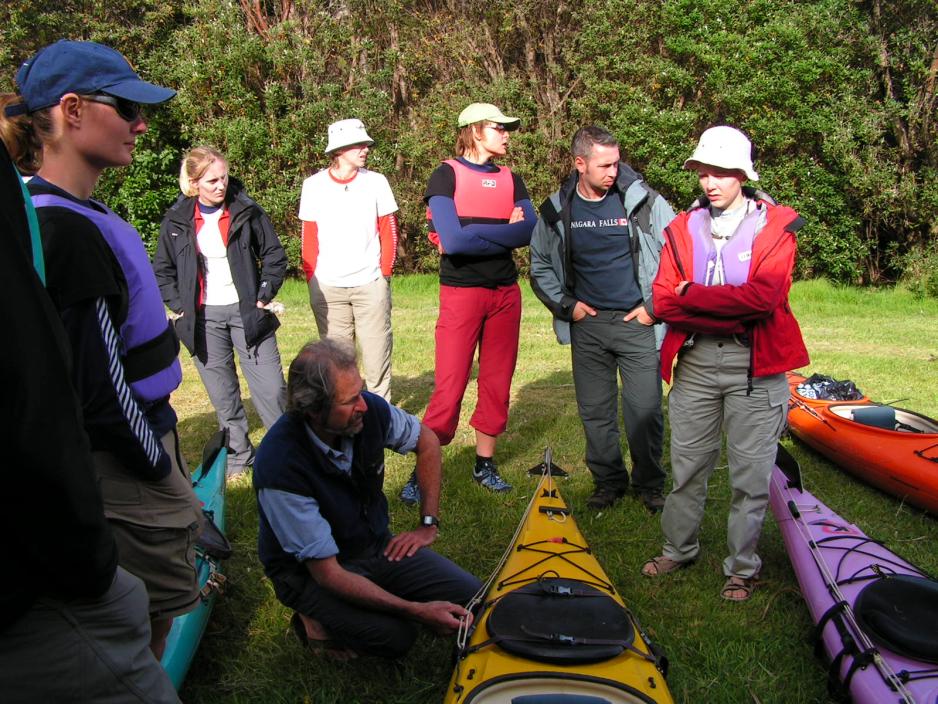Richard er instruktør og gjør mye ut av å instruere oss om kajakkenes virkemåte. Sikkert, og med forståelse for vår iver etter å komme på havet, fortelles om innstilling av styreredskapen, rorets virkning, påsetting av spreydekk, redningsvest etc. Dessuten gjennomgår han teknikken ved å padle med pagaj. Flere har aldri prøvd havkajakk før, så de, som er litt ”nervøse”, får en to-personers kajakk. Vi setter oss i kajakkene, tilpasser snorene til styretøyet og prøver utstyret. Instruksjonen er grundig og alle føler seg nå så trygge, at vi kan stable kajakkene på planet på traktoren og få dem fraktet ned til strandkanten.