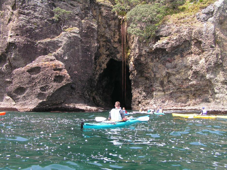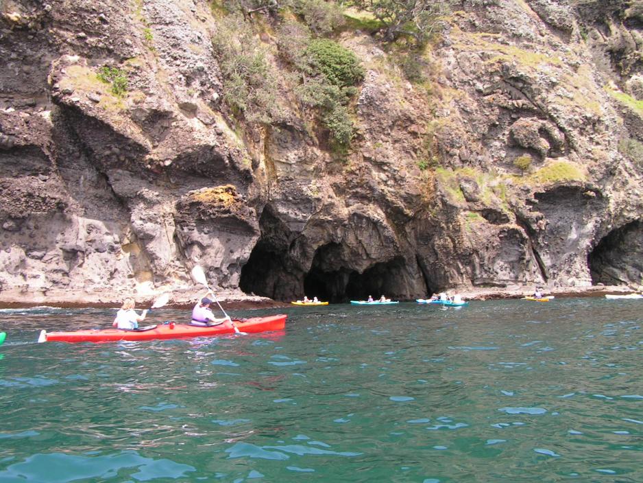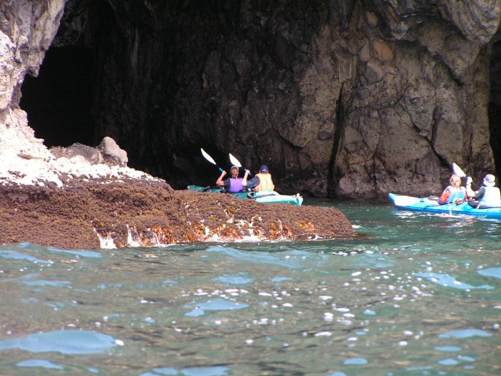 Richard leder an. Han kjenner jo ruten ut og inn og leder oss bort til noen store klipper, som står fritt ute i bukten. Vannet fra Stillehavet presses inn gjennom klippeskjærene og nå er det første gang, som vi skal prøve å ri på en bølge. Det går ganske bra og snart er vi alle igjennem denne første lille utfordringen.Alle kan nå manøvrere med ror og pagaj, og snart settes kursen inn mot land – over mot noen spennende grotter. Enkelte synes, at det kanskje er litt for dristig og unnlader å padle inn.