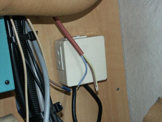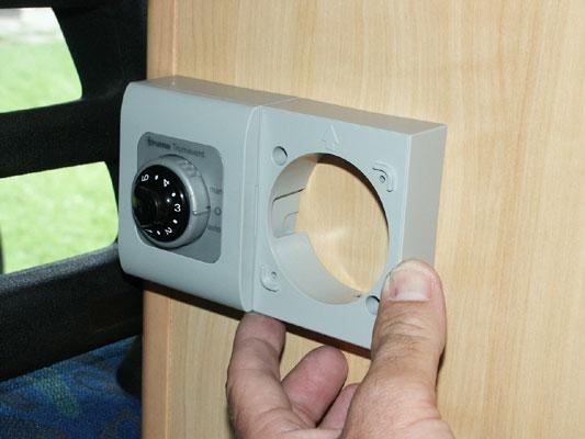 Termostaten plasserte vi inntil regulatoren til viften, og ettersom vi ikke har hatt noen problemer med temperaturinnstillingen ved gassdrift anså vi det unødvendig med en separat føler for termostaten. Kabelen mellom termostat og el-tilsats er komplett med kontakter, og den kan ikke monteres feil.