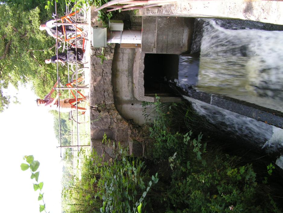 Vi sykler på den venstre bredden gjennom en liten lund på en fuktig sti med vann på begge sider og kommer fram til båtutleien ved Frederiksdal.Her faller Mølleå over en liten demning under broen ved Nybrovei og vi fortsetter et stykke på høyre bredd langs elven.Så krysses kanalen over Kobro med utsikt til de mange kanoroerne, som er på vei ut mot Lyngby Sø.