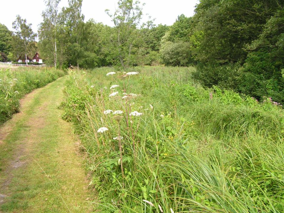 Ved Gedevase bro renner elven gjennom et sumpet område ved Grethes Holm og vi sykler på Kong Volmers Sti langs nordsiden av Farum Sø.Kun få steder er det utsikt til sjøen, da trærne, som henger helt ned i vannoverflaten, skygger. Et par steder er det imidlertid hugget ut og satt opp benker.Ved muren mod Farumgård er det også satt opp en benk med bord, der det er passe å ta en hvil.Vi passerer gjennom Farumgård, som er privateid, så det er fint at vi får lov til å ta denne snarveien. Men sykling er forståelig nok ikke tillatt, så vi triller gjennom parken.På den andre siden kommer vi gjennom den røde port. Vi svinger ned på Klaus Narssti og kommer fram til båtutleien ved Fiskebæk.