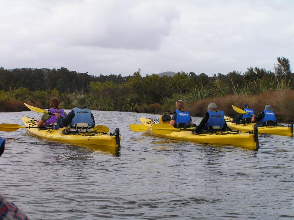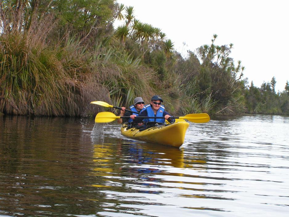 Vi har god tid denne morgenen og vår guide, Chris, sørger for pannekaker til frokost. Vi skal ikke bytte leirplass i dag, så teltene får lov til å stå.Midt på formiddagen går vi gjennom ”byen” bort til Okarito Nature Tours, der instrukser, utlevering av sprutdeksel og redningsvester blir gjort. Og så er det bare et par minutters gange ned til lagunen, der våre dobbeltkajakker ligger parat.Okarito lagunen, som er kjent for sitt rike fugleliv, er New Zealands største uberørte våtområde og dekker mer enn 3240 hektar åpent vann og kanaler omgitt av den fortryllende regnskogen.