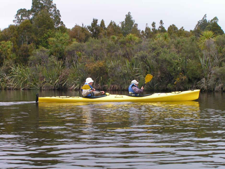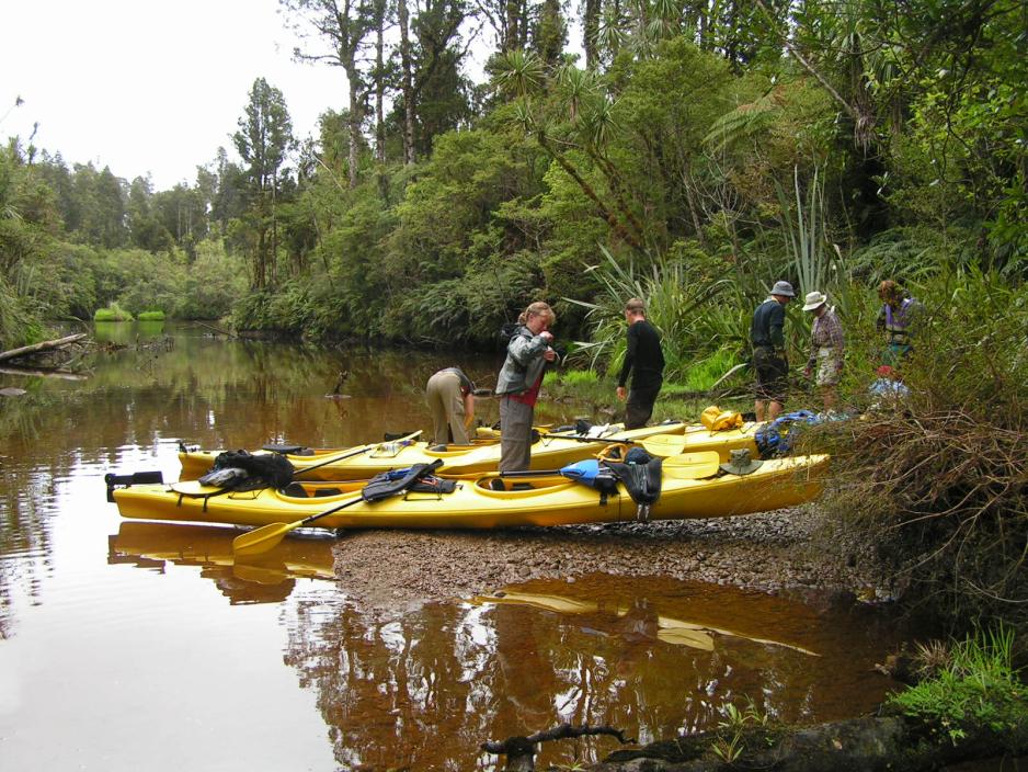 Et lite treskilt på en av stolpene forteller oss, at her kan vi svinge av og komme inn i elvedeltaets kanaler, som fører oss lengere inn i regnskogen.Her, blandt de store kahikatea-trærne, er det en vidunderlig ro og her er absolutt ingen merkbar strøm, slik at vi uhindret kan padle oppover kanalen. Og her hører vi ikke annet enn årene våre, som treffer vannet. Hvilken fred!Vi holder et våkent øye med eventuelle fugler, for her er det masser av muligheter for å kunne spotte ganske mange – og sjeldne - fugler. Vi legger oss tett på bredden og får da også øye på den lille vimsete ”fantail”, som sprer sine sort/hvite halefjær ut i en vifte, hver gang den lander.I kanalenes grunne vann skal vi samtidig holde øye med trestammer, som ligger skjult under vannets overflate og vi skal hele tiden manøvrere utenom disse og samtidig unngå å treffe trær, som henger ut fra bredden. Nå støter roret mot bunnen og padleåren kan ikke stikkes dypt. Vi er på lavt vann og roret trekkes opp ved å dra i ror-snoren. Vi er nå helt inne i kanalens bunn og kan umulig komme videre, så hvorfor ikke ta den medbrakte picnicen her?