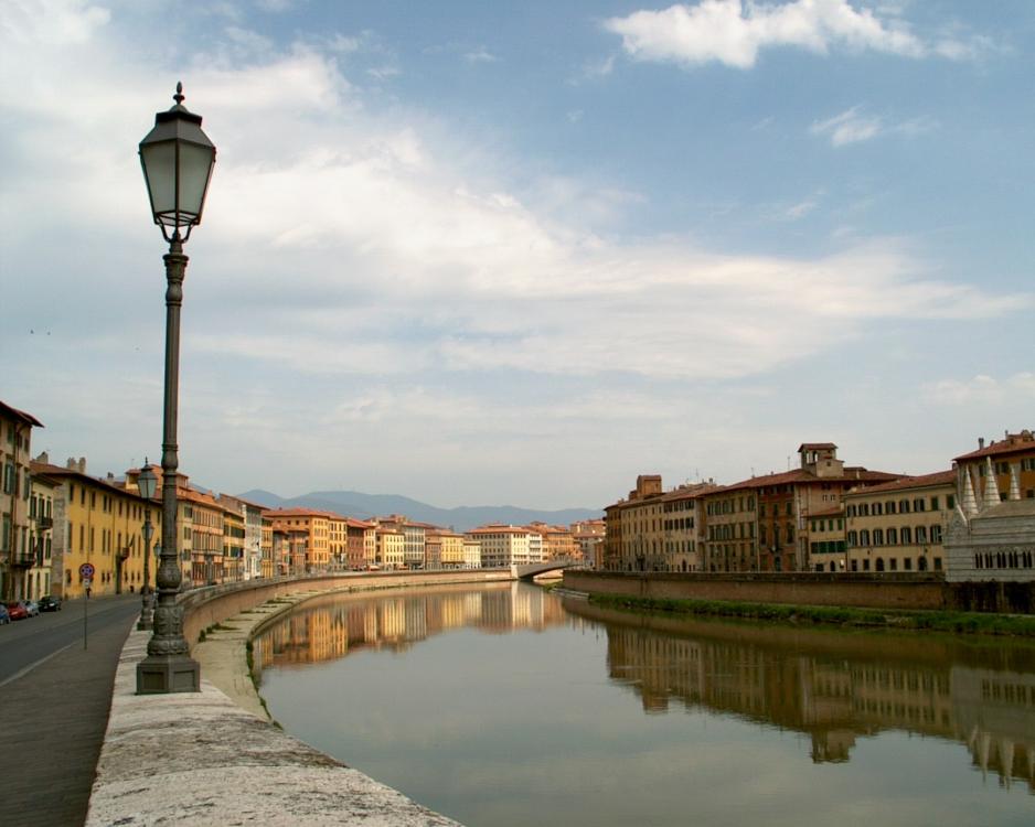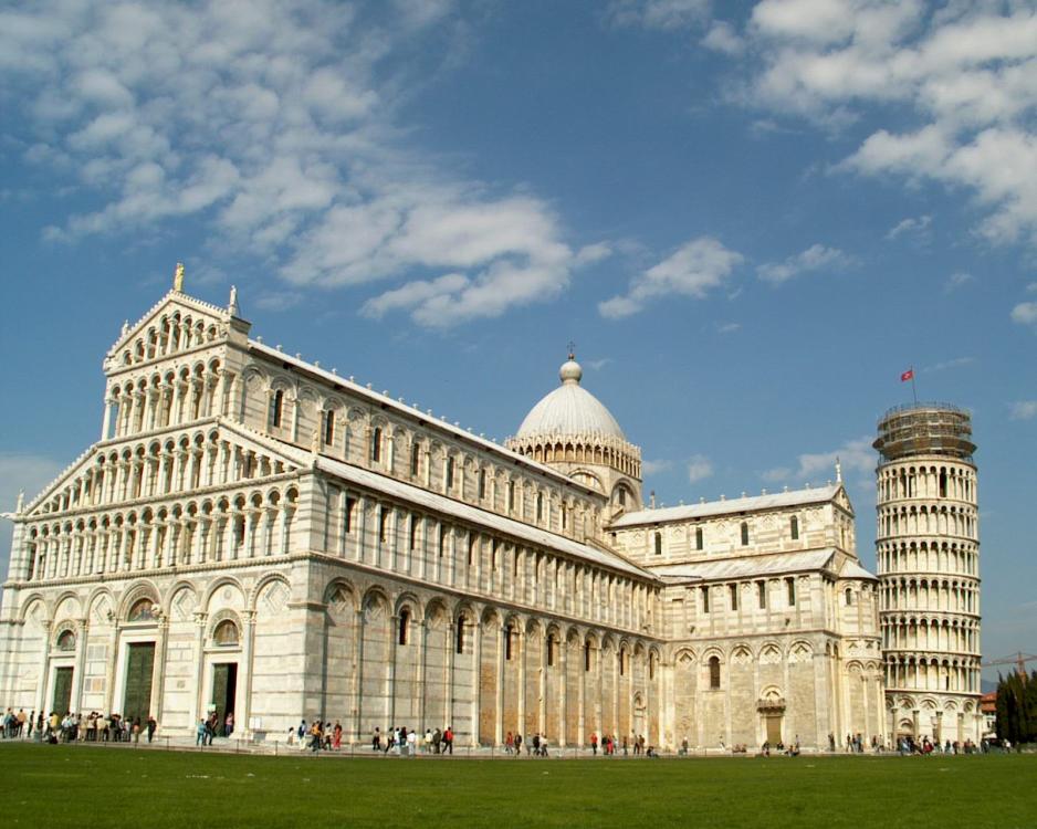 Pisa er delt i to av elven Arno, som går rett gjennom byen. Vi passerer en av de mange fine broene og fortsetter langs smale gater med små kafeer og hyggelige kunstforretninger. Vi går over store åpne plasser, der gatemusikanter står og spiller. Og endelig når vi vårt mål. Piazza del Miracoli, der det verdenskjente tårnet står. Men akkurat fra den retningen, som vi kommer fra, er tårnet ikke skjevt. Det står helt rett. Det har vært snakk om at det skulle rettes op. Jeg var der første gang i 1988 og da var det veldig skjevt. Er det noe vi ikke har hørt?