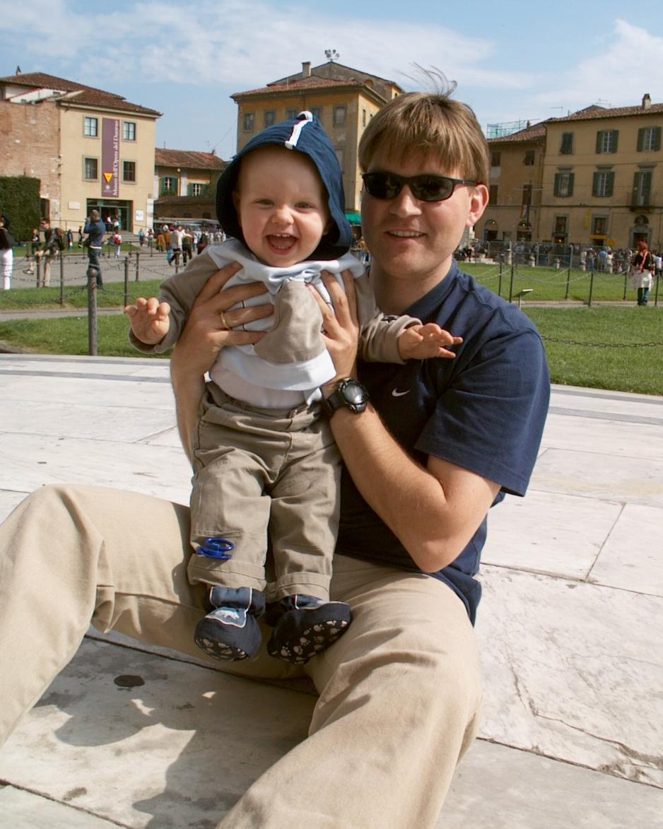 Vi har nettopp forlatt campingplassen, etter å ha sjekket inn og funnet plassen for campingvognen. Alt er pakket før vi dro hjemmefra, så vi har bare koblet til strøm og skrudd ned støttebenene, så er vi klar for nye opplevelser. Mathias sitter i bærestolen sin, solen skinner fra en blå himmel, mens vi går ned gjennom Pisas gamle bydel. Vi skal finne det skjeve tårn.