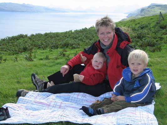 Våre barn, Mie på 1 år og Mathias på 3 år, sier ikke noe til den lange bilturen, så lenge vi tar de pausene som kreves. Det er mange og betyr, at vi ikke kommer så langt på en dag. Allerede nå tar vi dem med på kortere fotturer. Mie sitter i bærestol og Mathias går selv eller sitter på skuldrene til Rasmus, når det er behov for det.I fjellene er det viktig, at de er kledd på etter forholdene. Husk været kan skifte raskt, så ta med varmt tøy i ryggsekken uansett hva. Gå ikke for langt bort og start med korte turer for å sjekke stemningen.