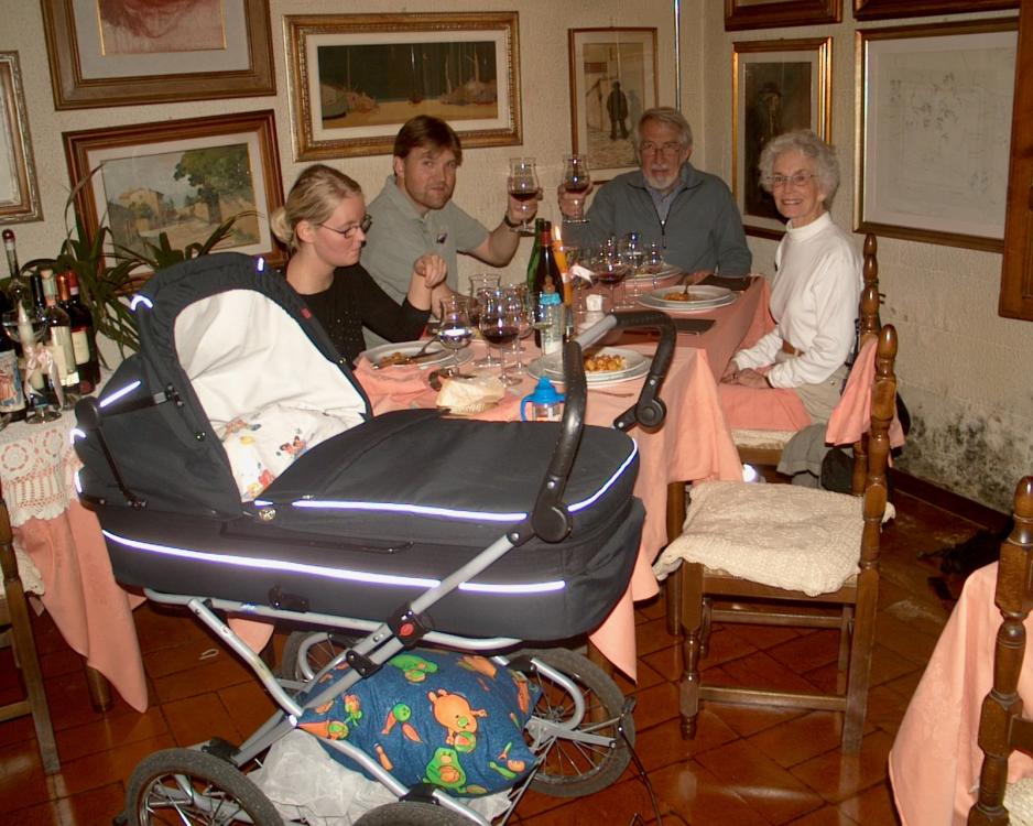 Vi ankom 3 timer senere til Firenze pga. kø de siste 30 kilometerene, så det var i ferd med å bli nokså sent. Våre amerikanske venner, som ventet på oss der nede, hadde bestilt bord på en av områdets beste spisesteder.Jeg skal ærlig innrømme, at jeg hadde mine betenkeligheter med å dra Mathias med på restaurant så sent på kvelden. Det var allerede langt over hans leggetid.Vi hadde kjørt hele dagen, så når ville hans grense være nådd? Og hvordan var forholdene på denne fine restauranten. Men det var absolutt ikke noe problem, verken for Mathias eller spisestedet. Vi ble ønsket velkommen og fikk flyttet litt rundt, slik at det ble plass til barnevognen. Mathias fikk sin flaske og falt straks i søvn, slik at vi andre kunne sitte og nyte et delikat måltid med allverdens spesialiteter fra det deilige Toscana.