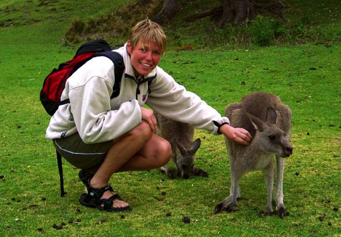 Vi kjører fra hovedveien og inn på en mindre vei. Det er lett å kjøre feil i Australia, for når man først kjører på en vei er den som regel meget meget lang. Der er ikke så mange muligheter. Plutselig ser vi en slange bevege seg ut på veien, og den stopper. Det samme gjør vi. Langsomt kjører vi nærmere, så vi har god tid til å nyte synet av de fine fargene fordelt på tre til fire meter. Først da vi er noen få meter fra slangen velger den å forsvinne inn i bushen. Der inne hvor vi skal sove i natt. Vi snur en gang til og kjører nå på en meget liten vei bestående av dyp løs sand. Vi setter 4-hjulstrekkeren på og det virker perfekt. Vi kjører 5-10 km. i timen og det er like før det blir mørkt da vi ankommer ”campingplassen”, eller rettere sagt det stedet hvor det er tillatt å campe for natten. Vi skynder oss å sette ut campingmøblene og avslutter dagen med å nyte en ubeskrivelig solnedgang over Det indiske havet sammen med to kenguruer, som forøvrig holder seg på god avstand. Det er det siste vi ser denne dagen. Silhuettene forsvinner i total mørke og vi kryper til køys under en stjerneklar himmel, som også ser helt annerledes ut enn den der hjemme. Slangen så vi heldigvis ikke mer til.