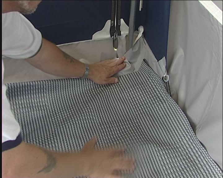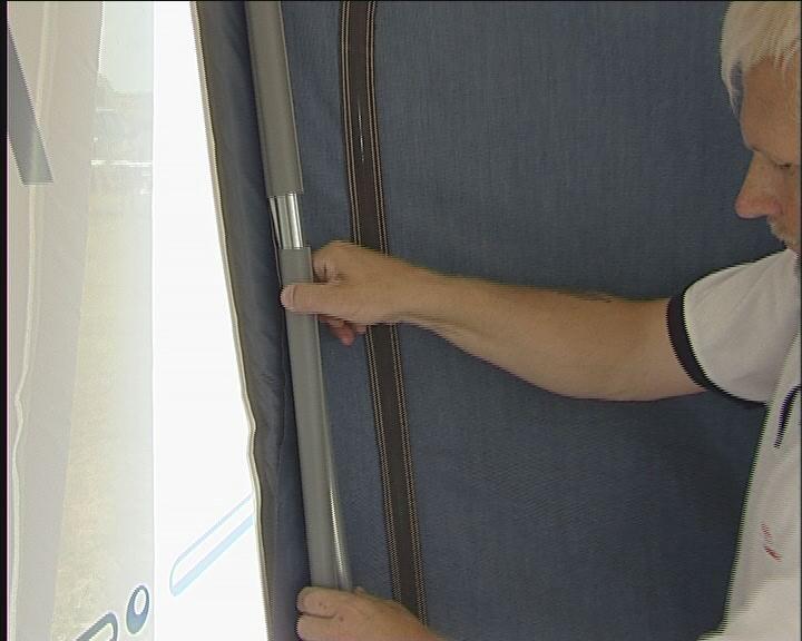 Start med å plugge helt inne ved campingvognen på begge sider. Det er viktig, at stangen og dermed teltduken står helt inn til vognen. Plugg også fotstroppen, slik at bakbeinet blir stående. Gjør det samme i den andre siden.