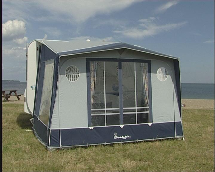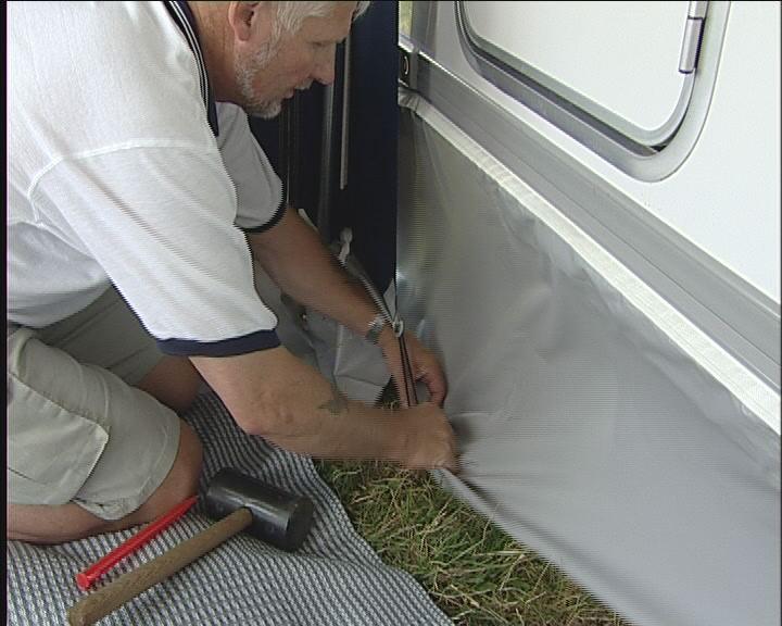 Dette understykket gjør at vinden ikke kommer inn i forteltet. Understykket settes fast i skinnen nederst på campingvognen og plugges fast til jorden.