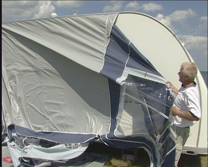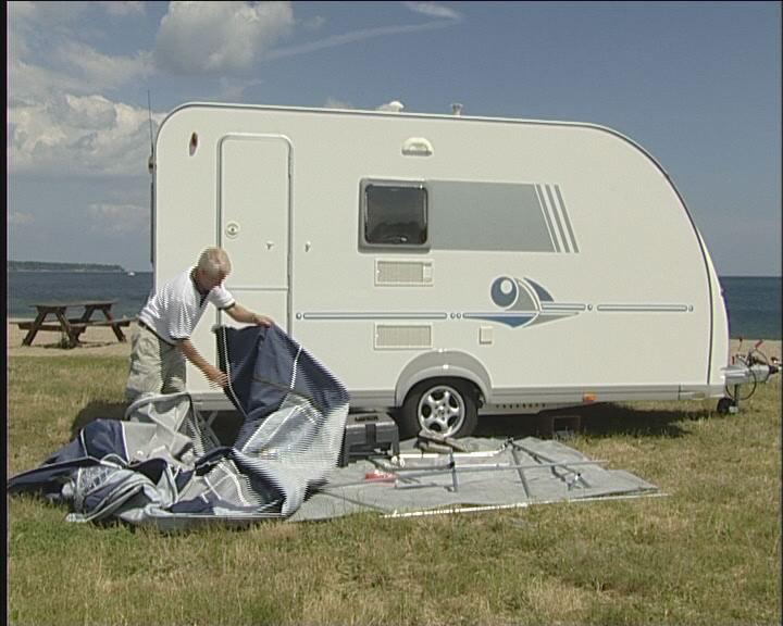 Teknikken ved å sette teltet på campingvognen er at nederste hånd skyver teltduken, mens den andre trekker. Når hele teltduken er inne i skinnen, kan den trekkes fram til det sted, der den skal sitte på vognen.
