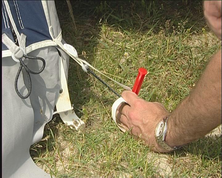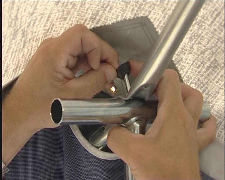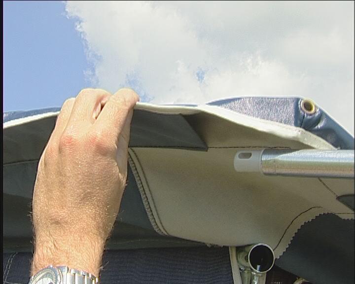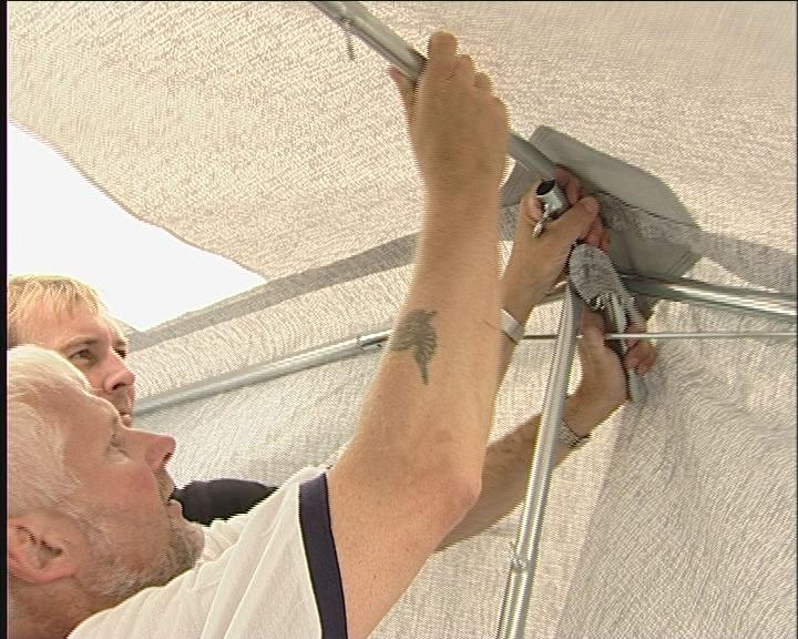 Teltduken føres nå inn på skinnen. Teknikken er, at nederste hånd skyver teltet, mens den andre trekker.