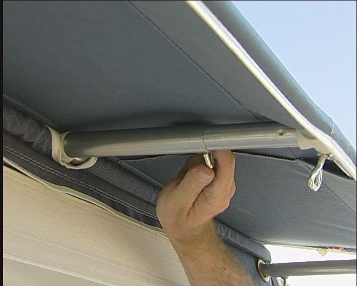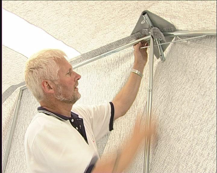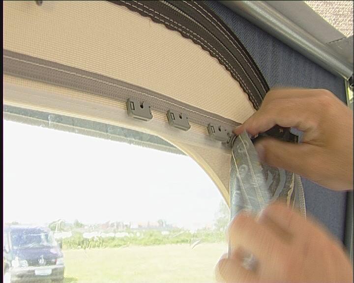 Sett Fix-on beslagene fast i skinnen øverst på teltet helt inne ved campingvognen.