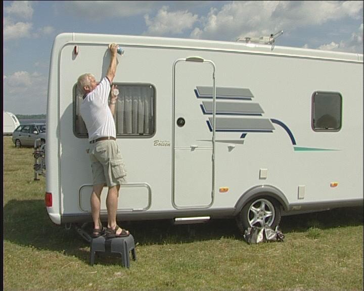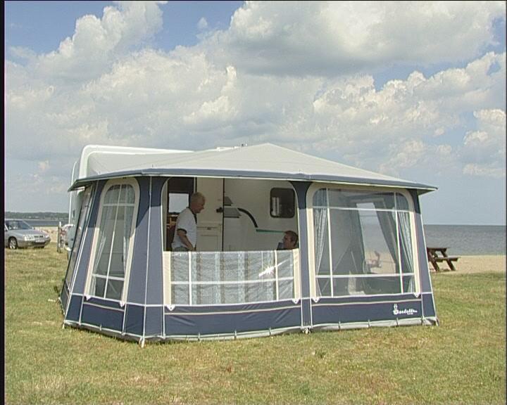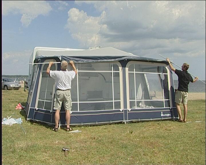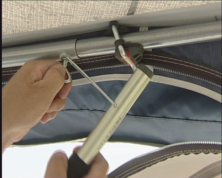 Bakbenet av teltet monteres på takstangen og settes i fotstroppen, så tett på campingvognen som mulig. Det gjør du i begge sider.