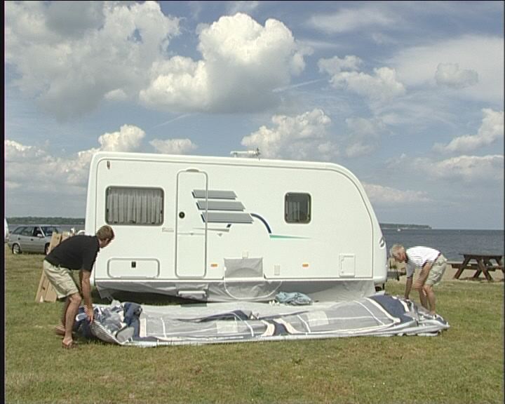 Taket brettes ut på teppet, slik at innsiden vender utover. På den måten skåner du teltets belegg. Gavlene rettes og legges godt inn over teltet i hver side