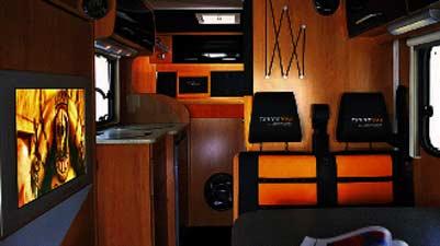 Tuning Van har høytalere nesten over alt, et topp musikkanlegg, DVD, og tre TV-skjermer, inkludert en stor flatskjerm